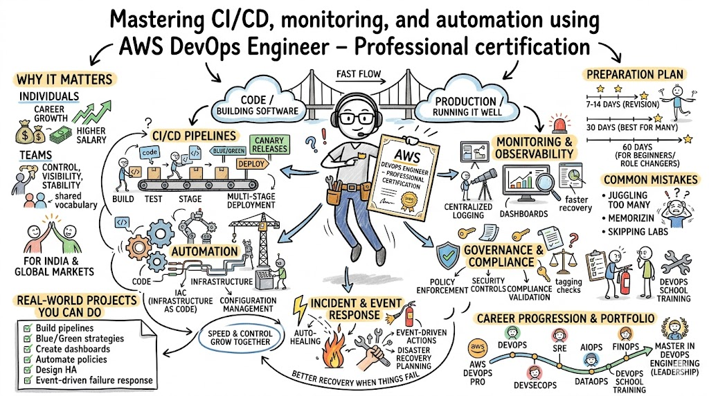 AWS DevOps Engineer – Professional is a professional-level certification focused on provisioning, operating, and managing distributed application systems on AWS. The DevOpsSchool course page also presents it as a learning path for automation, release engineering, governance, monitoring, incident response, and resilient cloud operations.